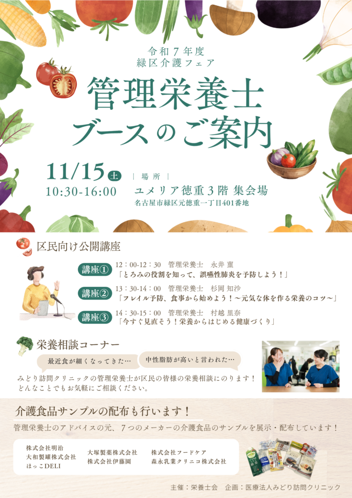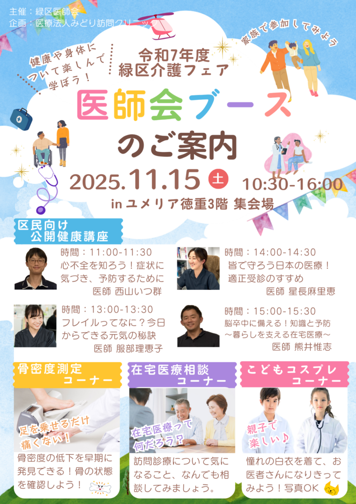 いよいよ明日、ユメリア徳重にて介護フェアが開催されます。当院からは骨密度測定や健康食品•補助食品のご紹介、子供コスプレなどの企画の他、医師や管理栄養士からセミナーも予定しています。